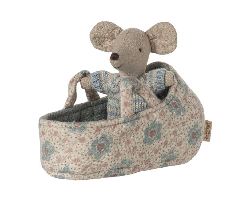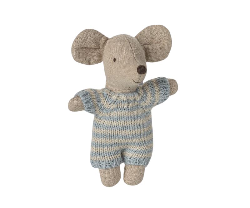 A small baby mouse in a soft and striped knitted suit. It sleeps for hours in its little quilted carry cot.