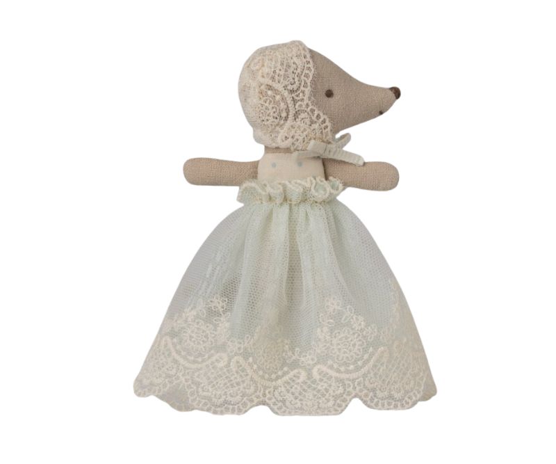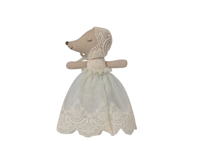 This baby mouse is dressed up for a day of celebration with a lovely dress and small bonnet full of beautiful details. Add baby mouse accessories to extend the story.