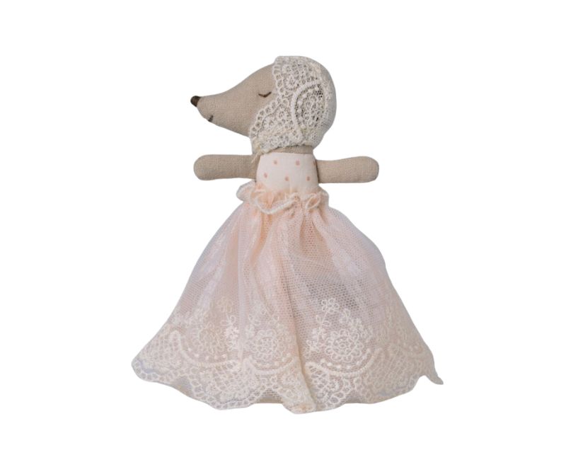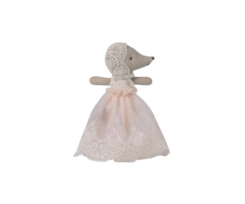 This baby mouse is dressed up for a day of celebration with a lovely dress and small bonnet full of beautiful details. Add baby mouse accessories to extend the story.