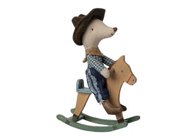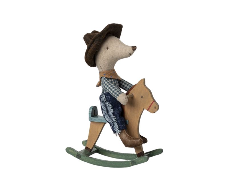 A fantastic set for hours of play. A cowboy mouse with magnets in his hands, dressed in jeans, a scarf, and a cowboy hat, rides on his rocking horse. Notice the small tail hole on the horse—a detail for the observant consumer.