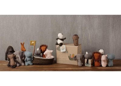 This fabulous story set from the Danish company Maileg consists of a soft boat with flag for the three animals to safely set off to sea. There is a lion with a fantastic brown mane, a grey rhinosaurus and a pink pig. Noah would be so pleased to see them getting on so well on their ark. A brilliant present for a baby, toddler or infant, a great way of encouraging their imagination and language through fantasy play.
