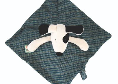 This Julius the dog comforter from La Grande Famille is cuddly and soft with plush black and white head and green, grey and blue striped “body”.