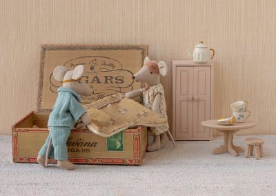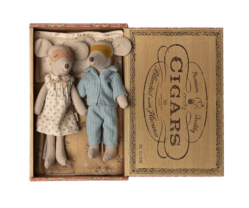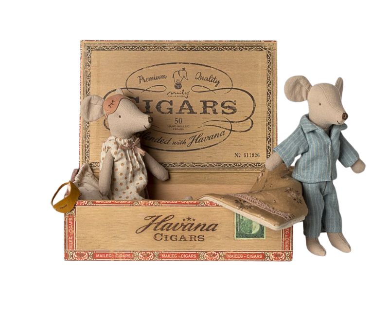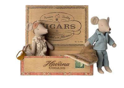 A classic Maileg item. Mum and Dad mice are wearing their beautiful nightwear and eye masks. The cigar box is a perfect bed for a good night’s sleep and sweet dreams.
