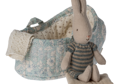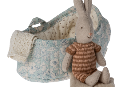 This playset is the perfect start to any story. A soft carry cot made in a beautiful fabric where the small bunny in a knitted light blue and cream playsuit can easily be tucked for a nap, all covered up in a knitted blanket to keep warm and cosy.