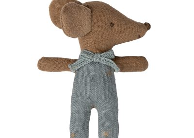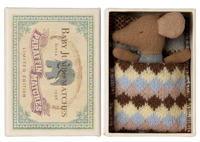Don’t wake the baby! These mice really are quite clever. They have two differently embroidered eyes, one is closed and fast asleep, the other wide awake. Perfect for little ones getting used to their new baby sister or brother. Each mouse comes with their own sleeping bag to keep them cosy in their stylish matchbox. A lace bow finishes the baby’s sleepsuit. Also available in rose. Size – baby mouse, height 8cm, age 3+ years, wash at 30° , material – cotton