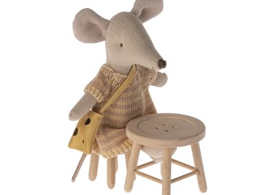 A stool and table set made for the mouse family. It is inspired by buttons and can be mixed with other mice furniture and accessories to create a lovely home. It fits perfectly into the Mouse hole Farmhouse.