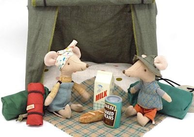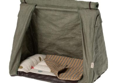 Brilliant for Maileg Mice who can’t get enough of the outdoors. This easy open ridge tent has the low impact camping look. The green, cotton canvas can be rolled up to reveal the spotty mattress, pillows and cosy mustard blanket.  Camper mice and accessories can be purchased separately.  Size to fit big and little brother/sister mice, dimensions (height 17 cm, width 21cm, depth 14.5cm. Age 3 + years, hand wash only, materials cotton/linen
