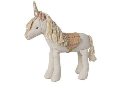 A magical story is about to begin. With this unicorn made in colourful tones and a golden horn, there are many stories to tell. The unicorn comes with a saddle for a comfortable ride. Fabric may vary.